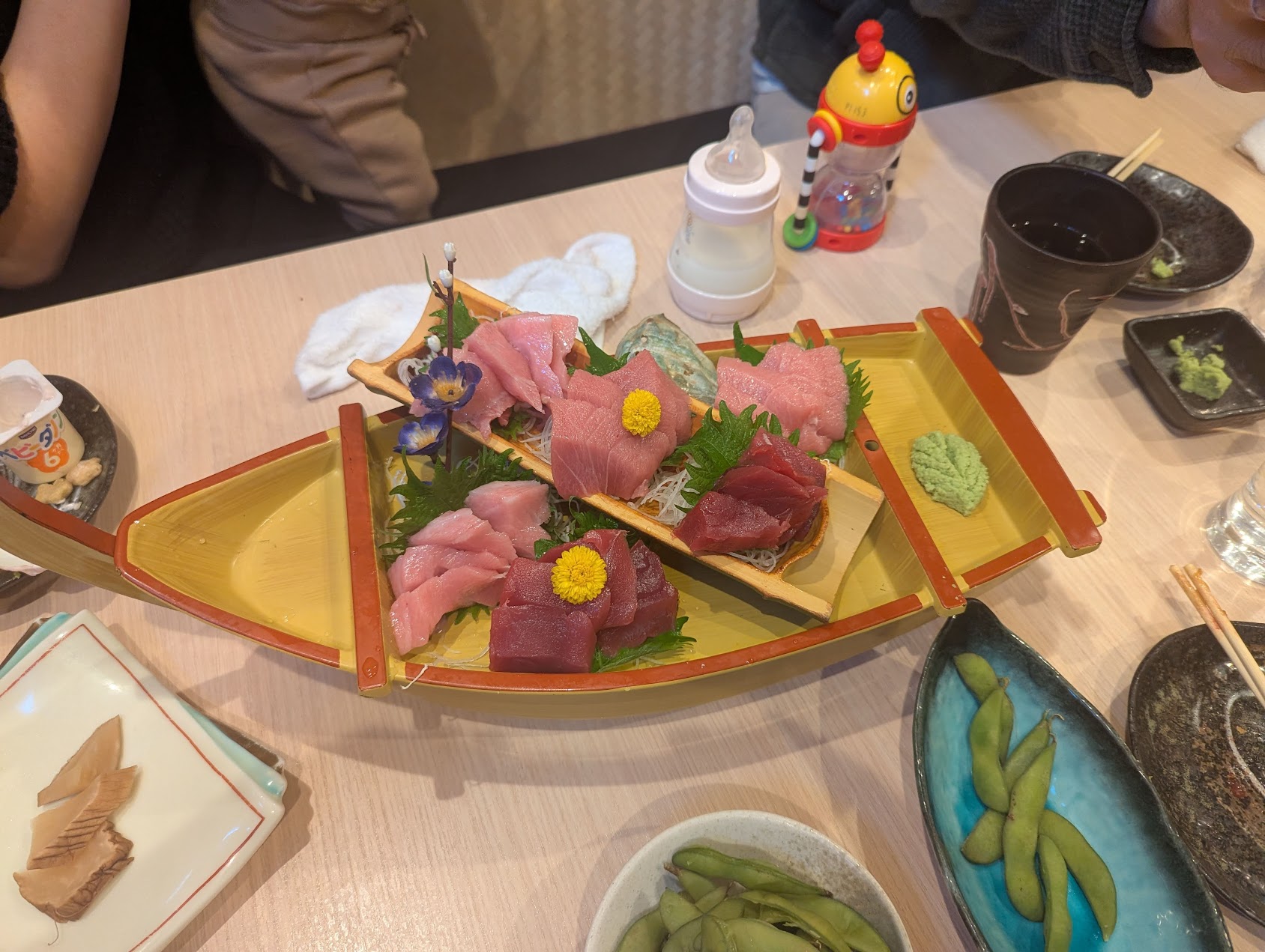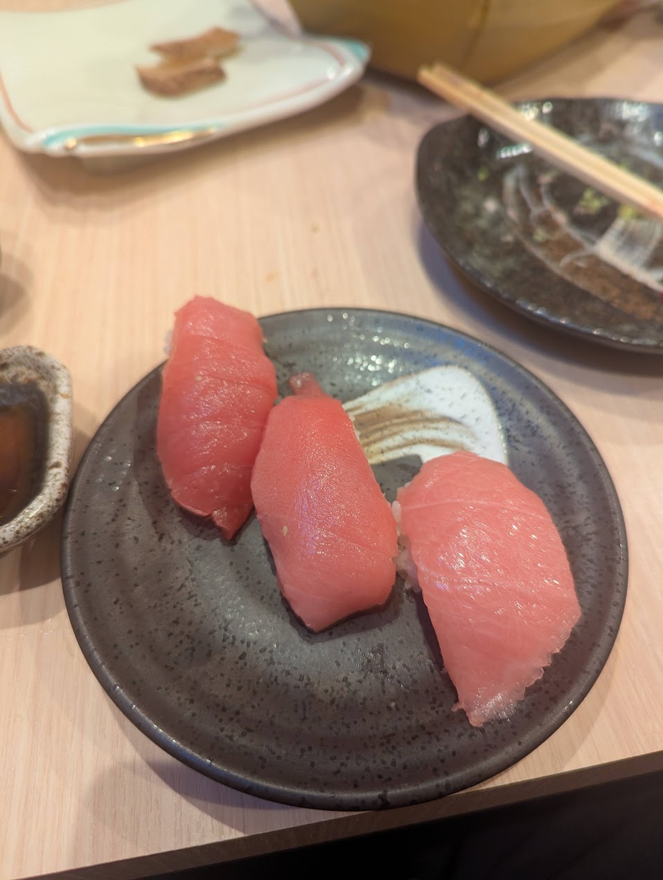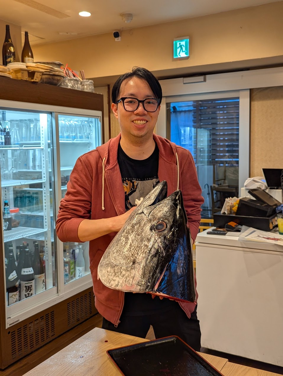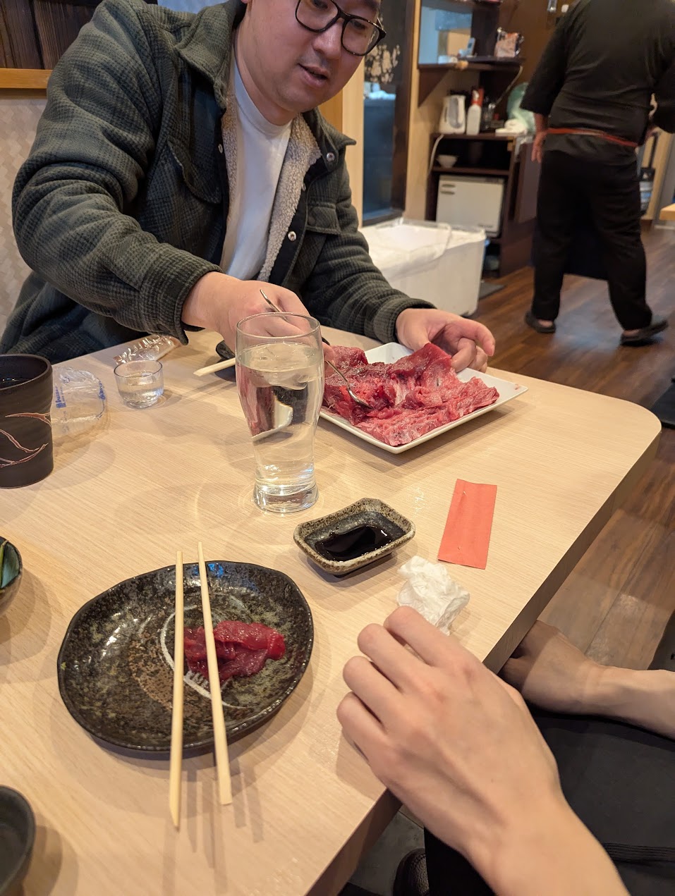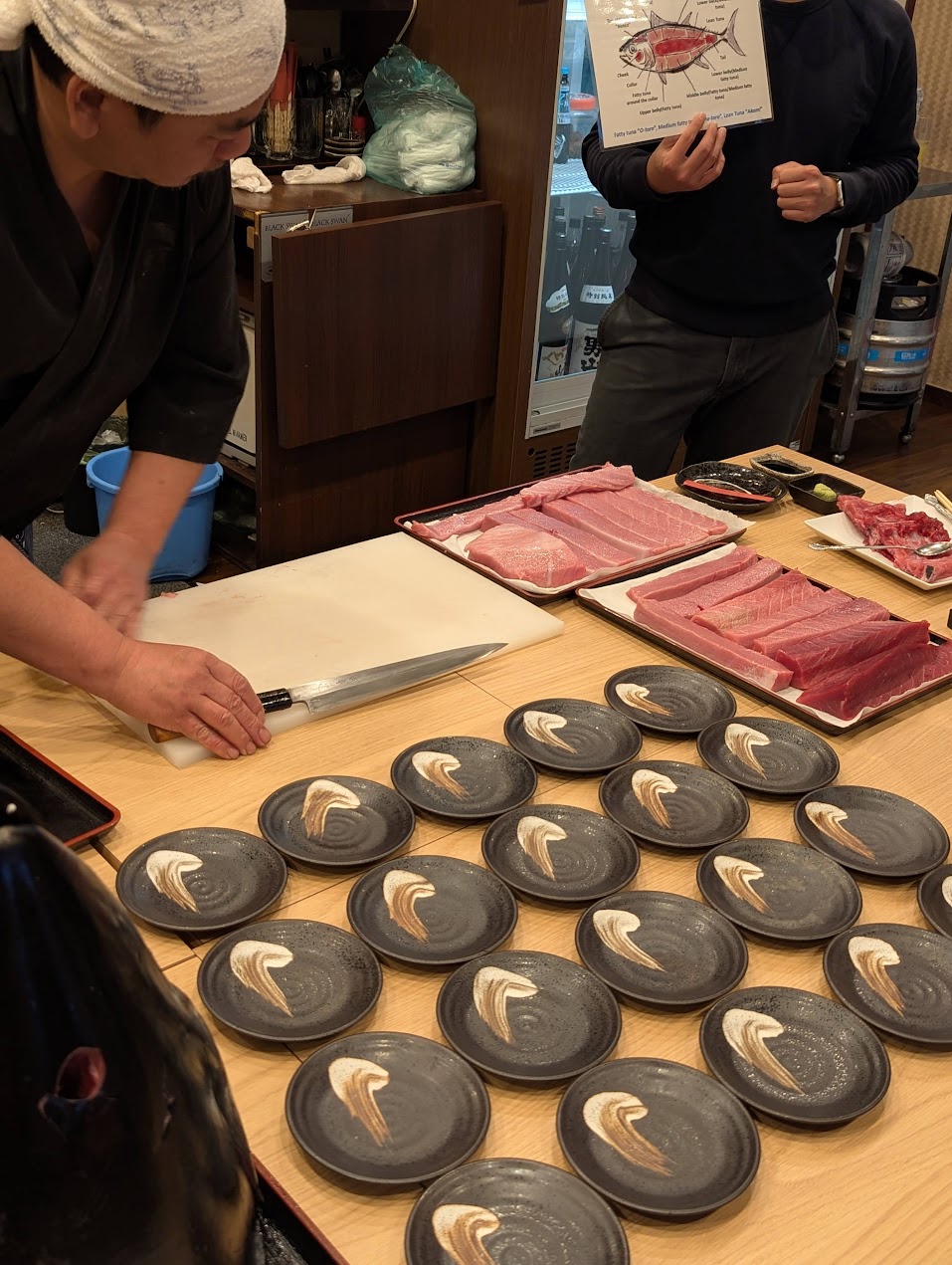 We were seated alongside a friendly Korean couple from the Seattle area, who were traveling with their adorable infant. It was a pleasant surprise to connect with fellow Pacific Northwesterners in the heart of Tokyo. The tuna cutting show itself was a spectacle—a skilled chef wielding an enormous knife, expertly breaking down a massive tuna into perfectly portioned cuts. The sheer size of the fish was impressive, and the chef’s precision was mesmerizing. Of course, the real highlight was the tasting. The tuna was incredibly fresh, melting in our mouths with a rich, buttery flavor. Paired with endless pours of sake, it was a truly indulgent and unforgettable culinary experience.