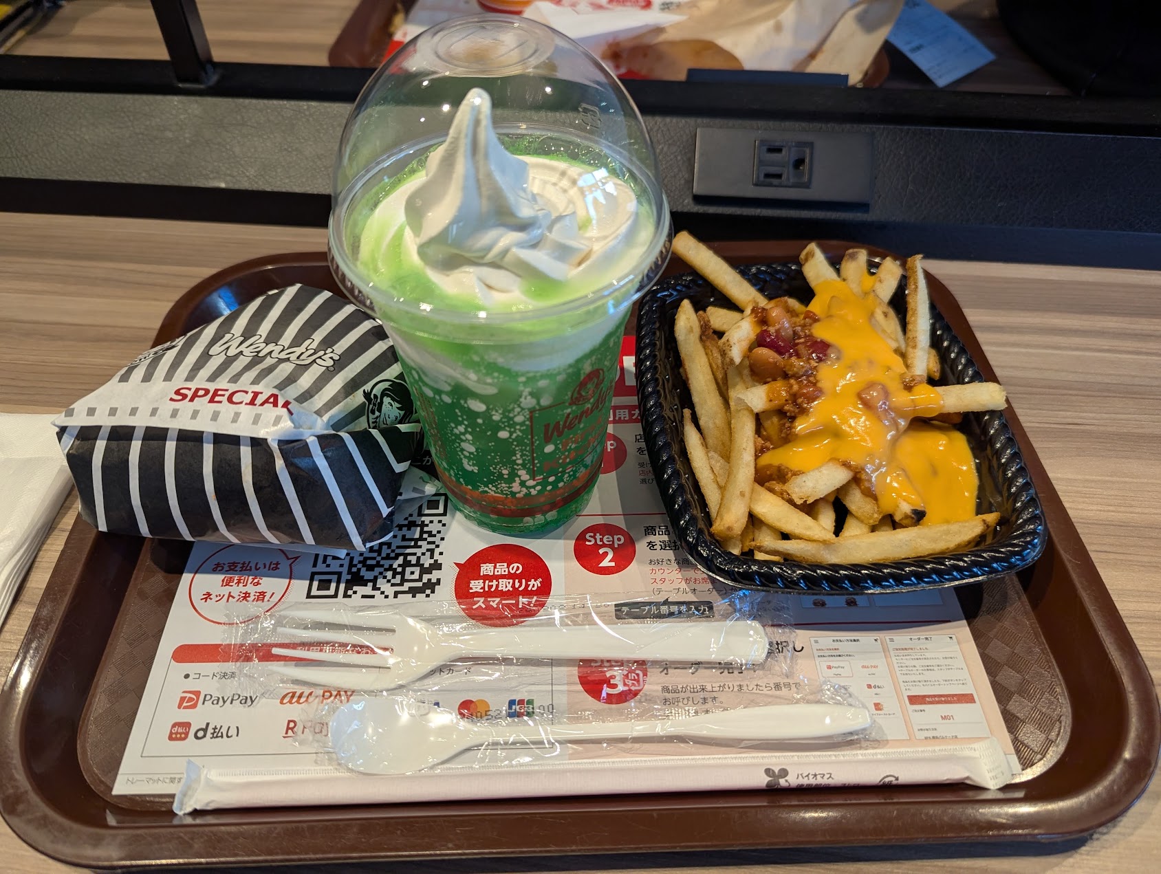 Today’s adventure took us to the vibrant district of Shinjuku. We kicked things off with a visit to Wendy’s First Kitchen, a Japanese spin on the classic American fast-food chain. I opted for the intriguing “Wild Rock Burger,” a unique creation featuring two square burger patties fresh off the grill in place of a bun. It was a delicious but messy proposition, as the lack of a bun made the burger a bit unwieldy! The experience wouldn’t be complete without some American-style sides, so I added a melon soda float and chili cheese fries to complete the meal.