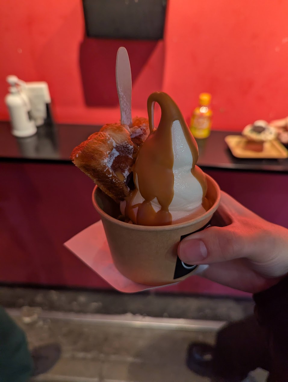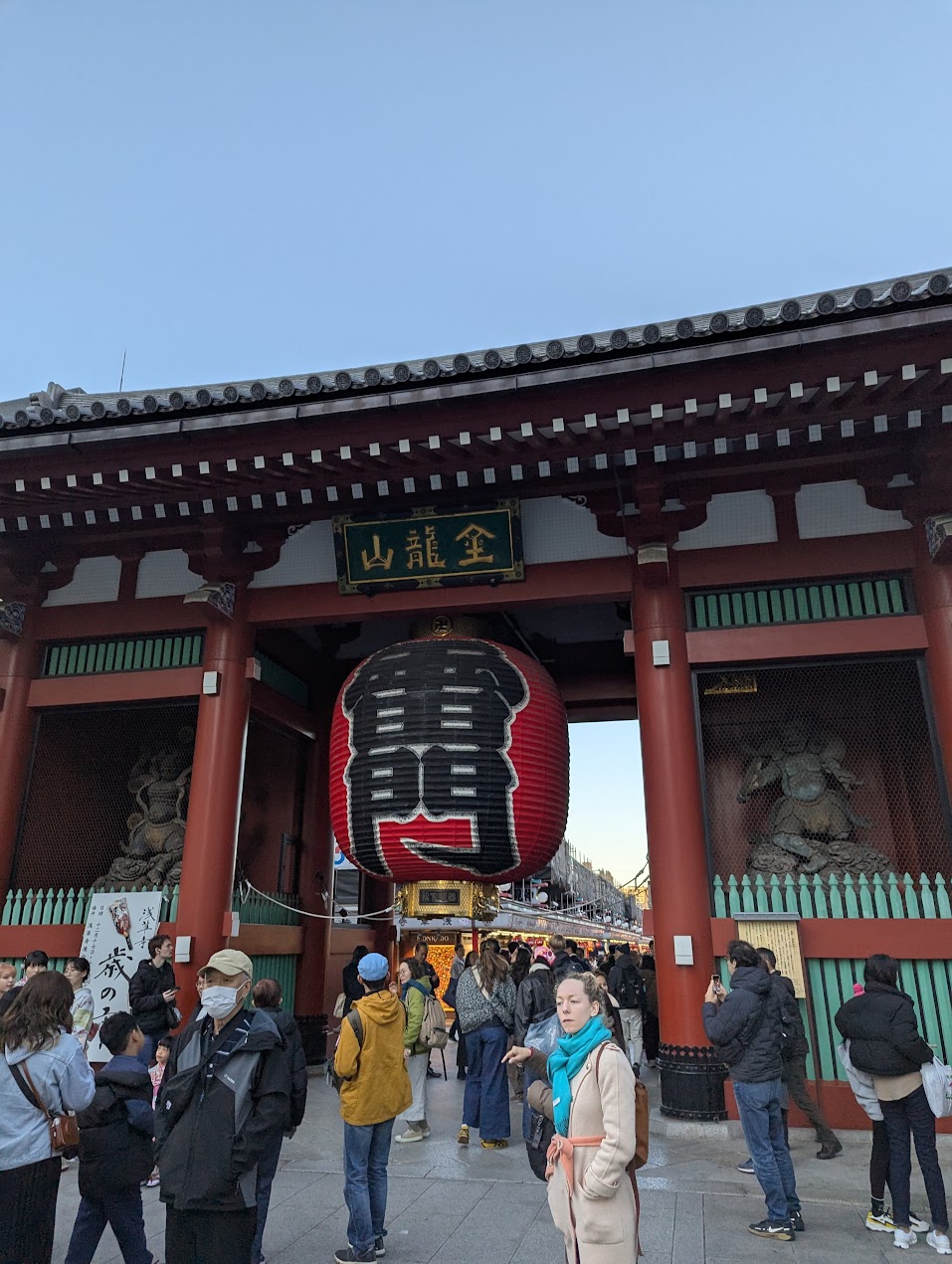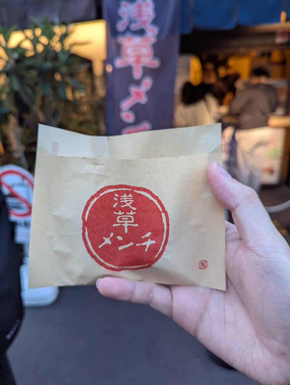 Later in the day, I shifted my focus to exploring more public spaces in Tokyo. I met up with Alex and Abdul, and we headed to Asakusa, a historic district known for its temples and traditional atmosphere. We visited Senso-ji Temple, a beautiful and iconic landmark. Before reaching the temple, we strolled through Nakamise-dori, a bustling street lined with traditional shops and food stalls. While the food options didn’t particularly entice us, we did make a stop for some Asakusa Menchi (deep-fried minced meat patties) and some refreshing ice cream.