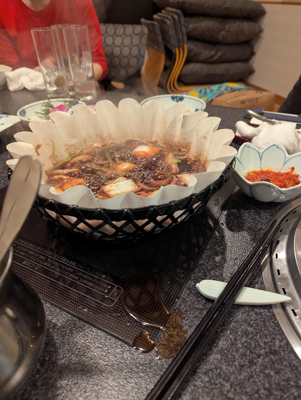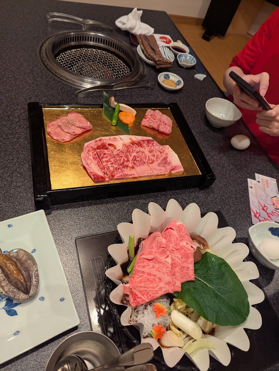 Finally, we made our way to Rokkasen for a much-anticipated all-you-can-eat yakiniku and sukiyaki dinner. The food was quite good, although the dining experience was different from our previous yakiniku meals, as we were responsible for grilling the meat ourselves at our table. It was a more interactive and casual approach. Another interesting touch at Rokkasen was that they took a photo of our group and printed it out for us as a souvenir—a nice memento of our meal. It was a fitting end to a day that had taken us from the world of tech and office dining to the vibrant shopping streets of Tokyo and finally to a satisfying all-you-can-eat feast.