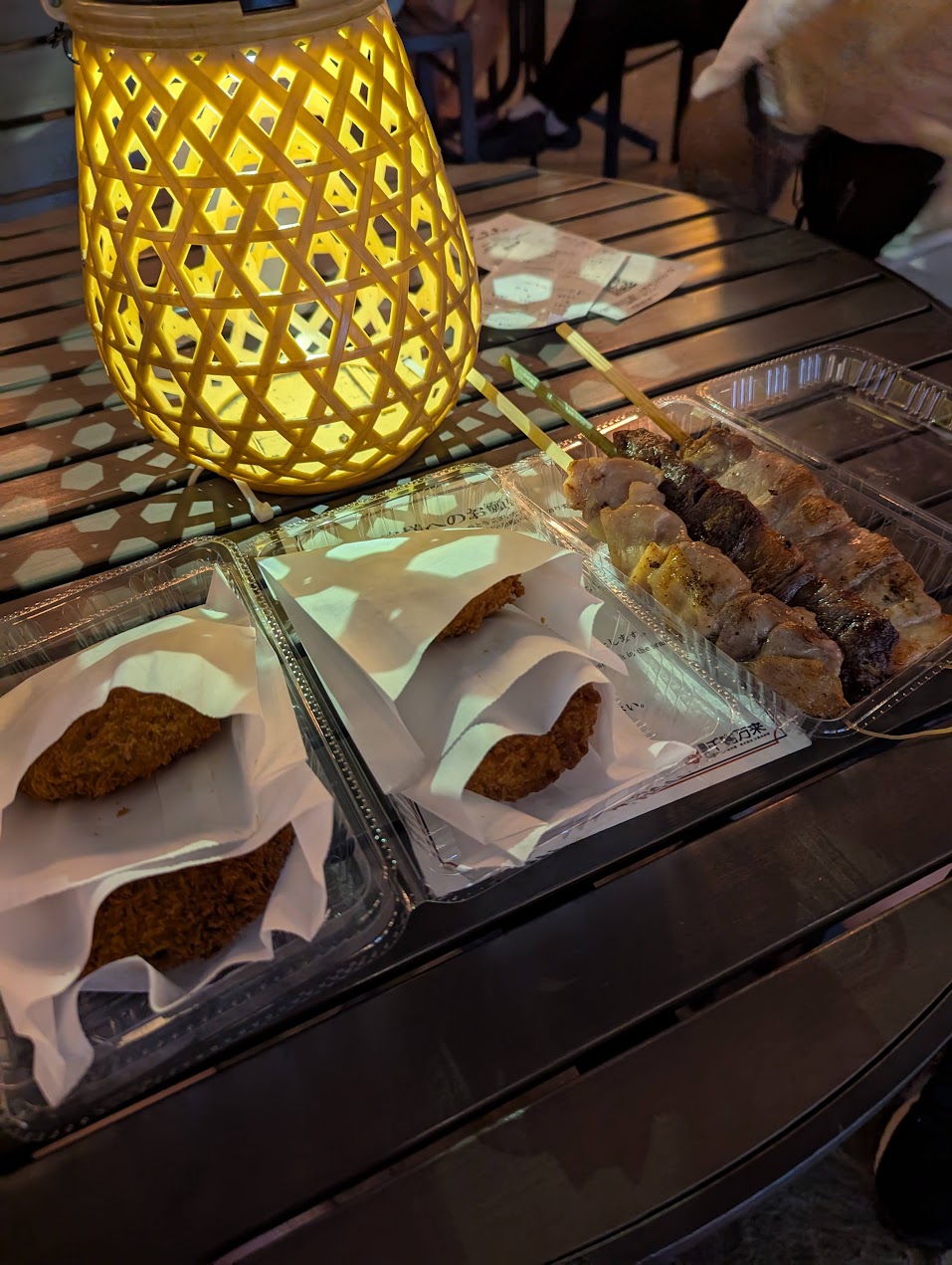 We ended the night back at Toyosu Senkyaku Banrai, specifically at Nikuzuki Daikokuten. After a day of chasing digital monsters and plastic capsules, nothing hits quite like a mountain of meat skewers and croquettes. My feet are screaming, my wallet is lighter, but my Gacha luck is legendary.
