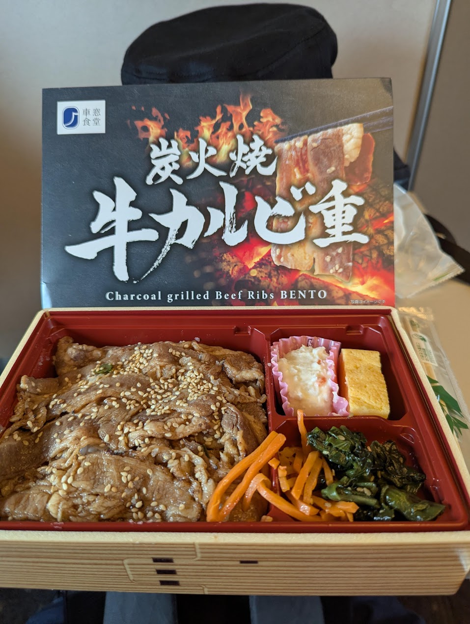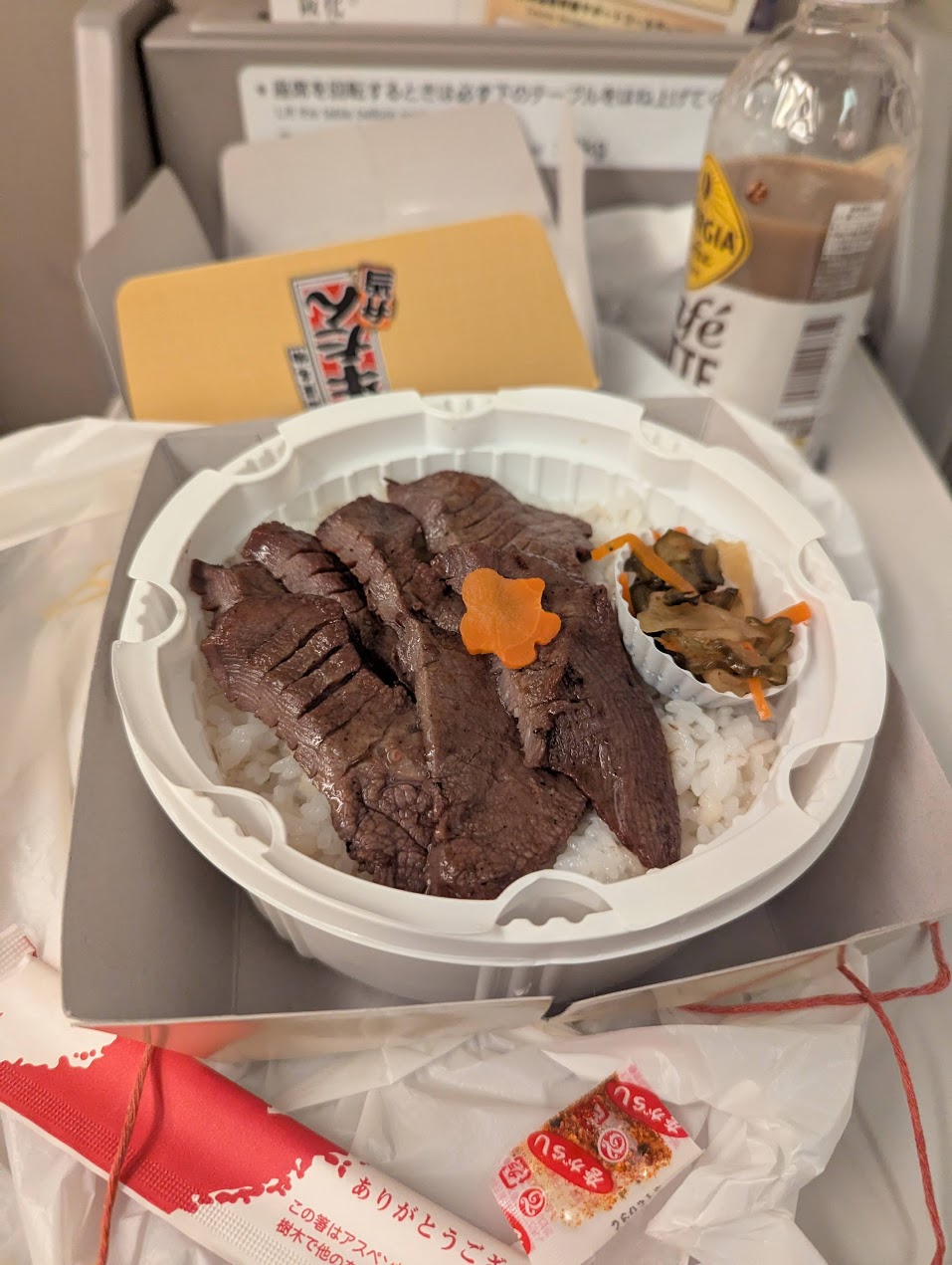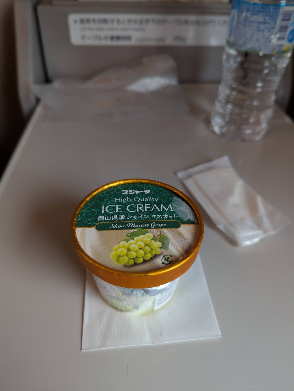 Speaking of snacks: the ekiben game was strong. I opted for the self-heating beef tongue bento because there is nothing more satisfying than pulling a string and watching your lunch steam like a miniature locomotive. To top it off, I used the QR code at my seat to summon a Shine Muscat grape ice cream. Having gourmet fruit-flavored dairy delivered to you at 175 mph is the peak of human civilization. Period.