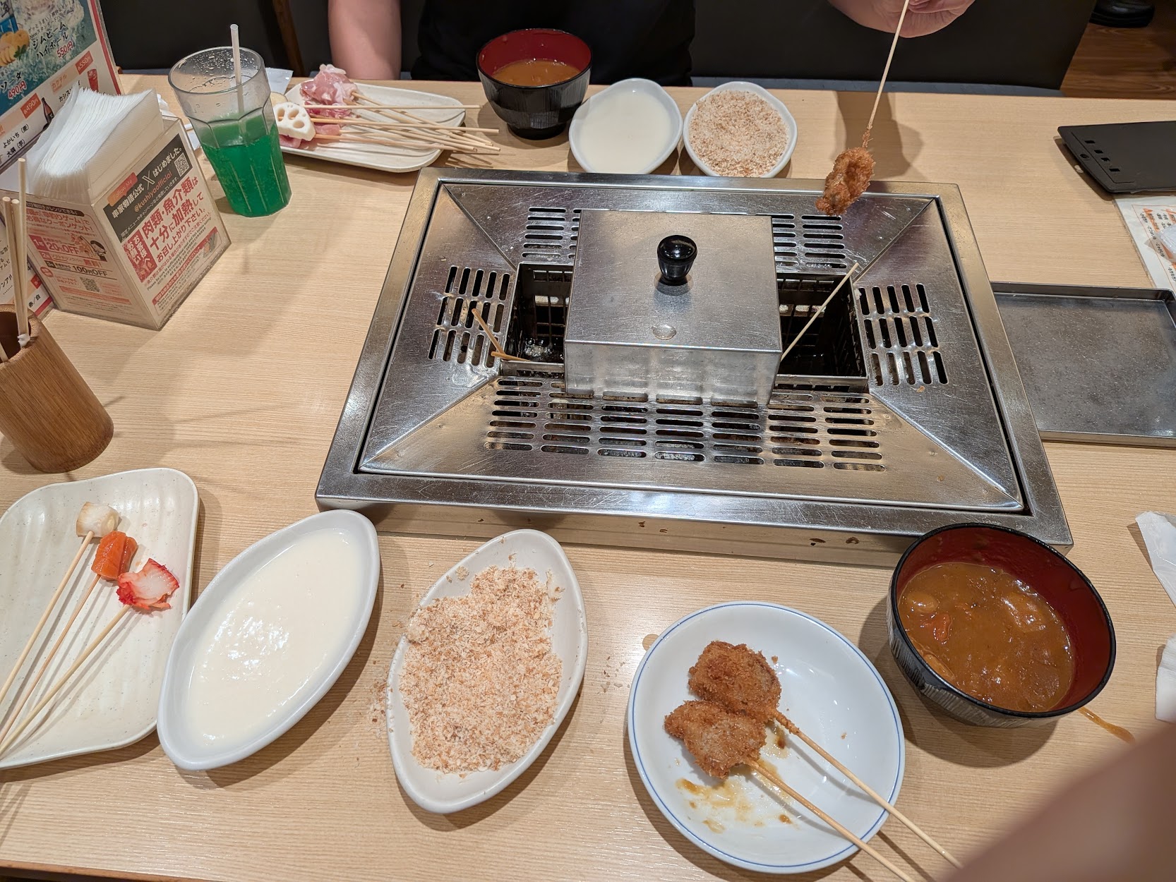After some therapeutic junk-shopping at Daiso and losing a battle with the claw machines, we headed to Kushiya Monogatari for dinner. It’s an all-you-can-eat skewer place where they hand you raw food and expect you to be the chef. It’s a bold business model, really. After 90 minutes of watching Nick and Vincent treat their fryers like high school chemistry sets, I was stuffed, exhausted, and ready to go horizontal.