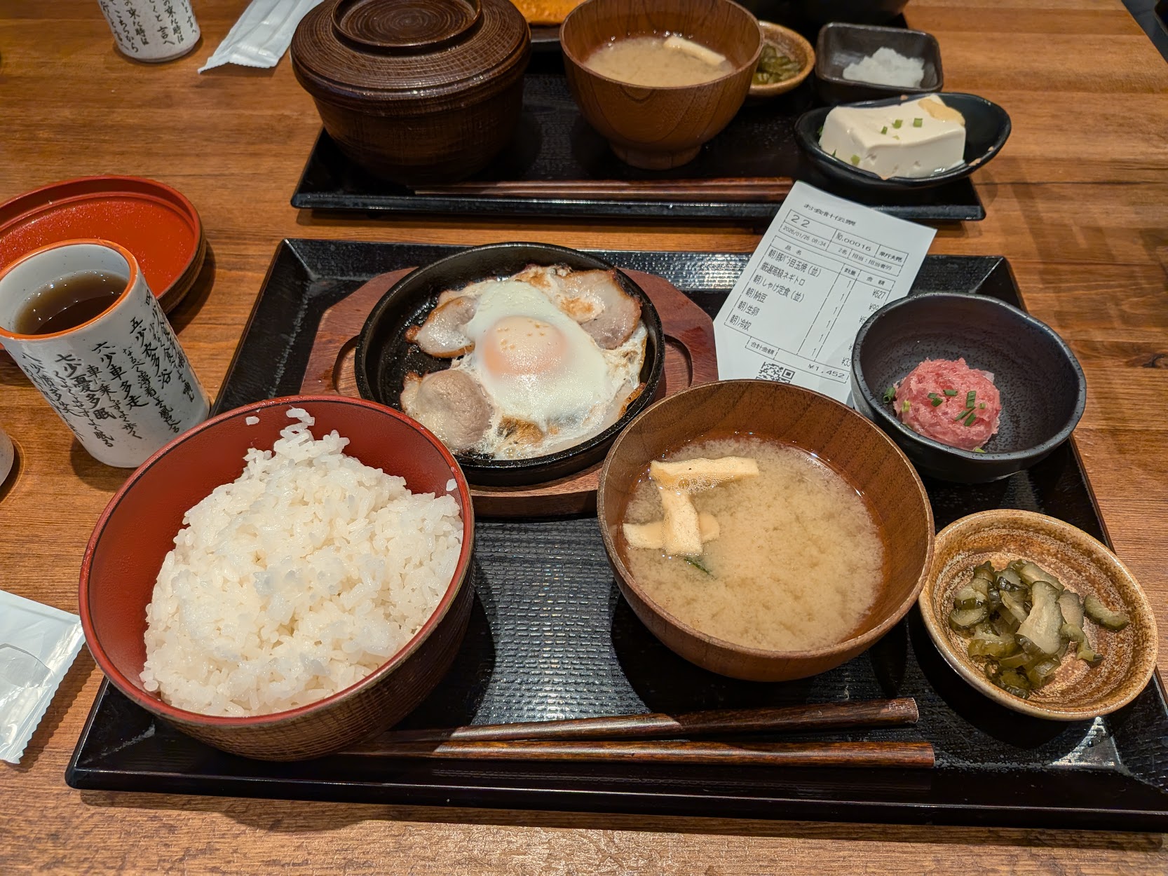 The morning started with the unholy ritual of packing, because apparently, even the best hotels expect you to actually leave by 11:00 AM. Takashi swung by, and we managed to grab a “proper” Japanese breakfast set—egg, pork belly, rice, pickles, negitoro, and miso soup. It was a refreshing, high-protein change from the “hotdog-in-sad-bread” aesthetic I’d been living off of.