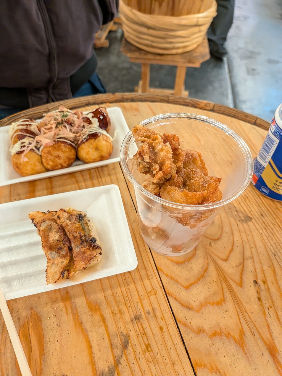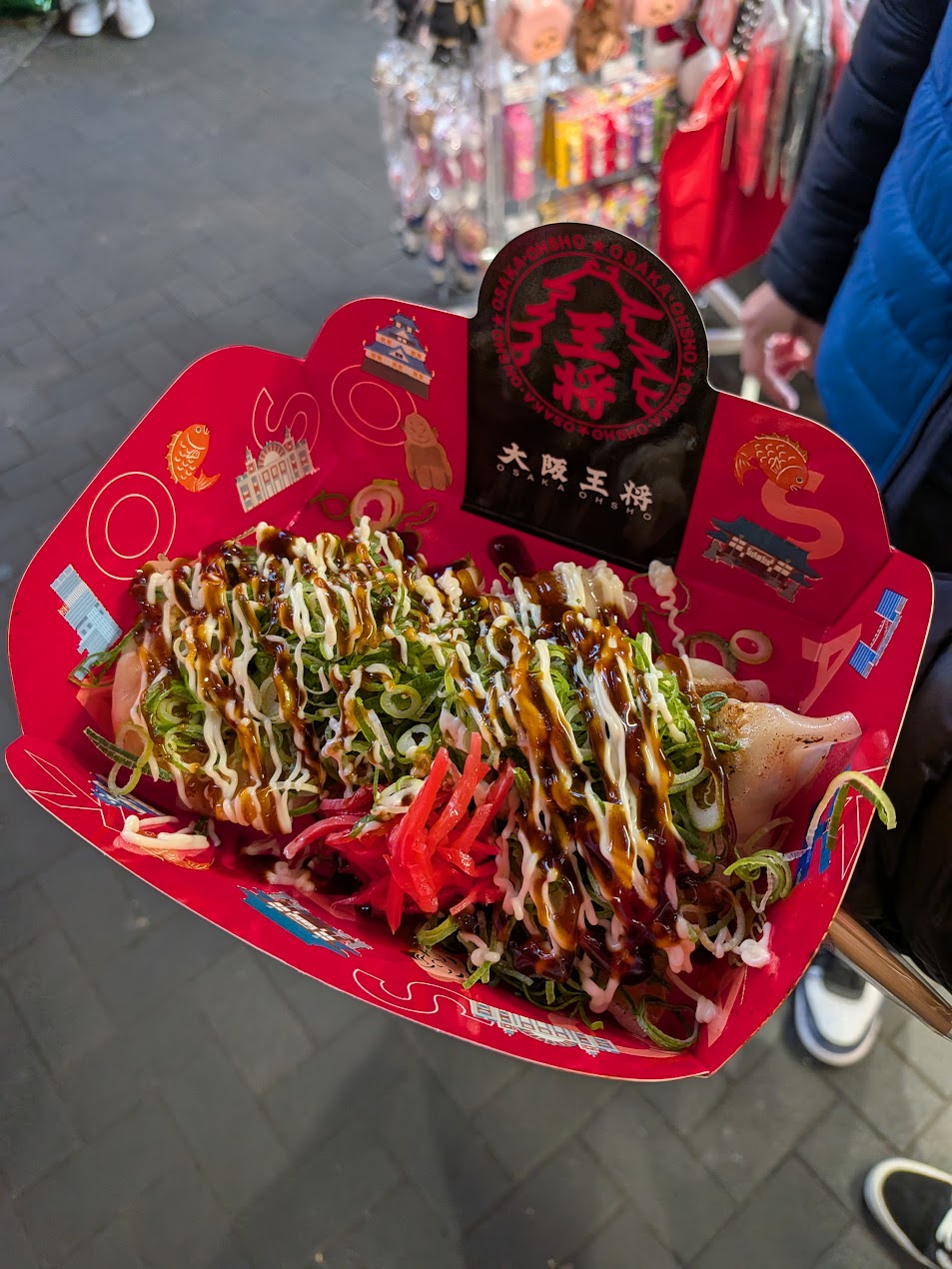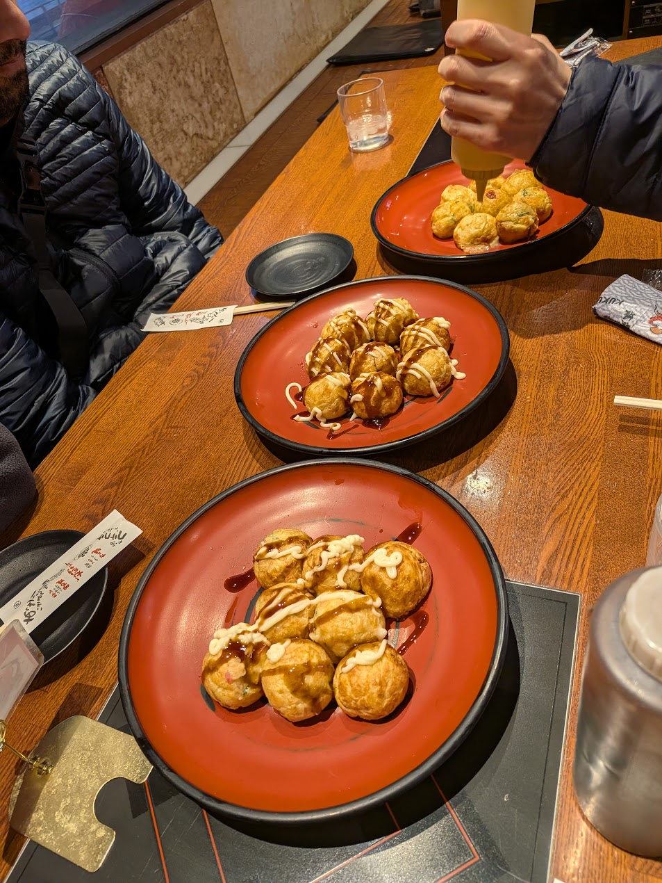 Feeling revived, I did some retail therapy at Patagonia and Adidas. I was supposed to meet the guys at Donki, but it turns out the entire group—Takashi and Abdul included—was also feeling like garbage after the heavy lunch. We scrapped the Ferris wheel and boat ride plans in favor of simple survival. We eventually linked up in Dotonbori for a street food crawl. We hit Kururu for takoyaki and tried “Dotonbori gyoza,” which is just takoyaki sauce dumped on top of dumplings. Spoiler alert: it’s not an improvement on the original.