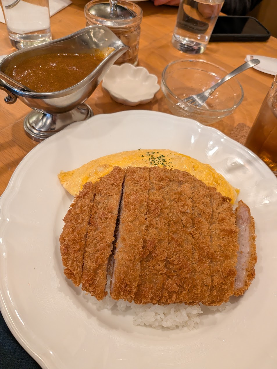 We regrouped with Takashi for a curry spot that was cash-only and, predictably, excellent. I went for the “if your heart doesn’t stop, you didn’t order enough” special: a jumbo katsu curry topped with a cheese omelette. It was heavy, it was greasy, and I loved every second of it.
