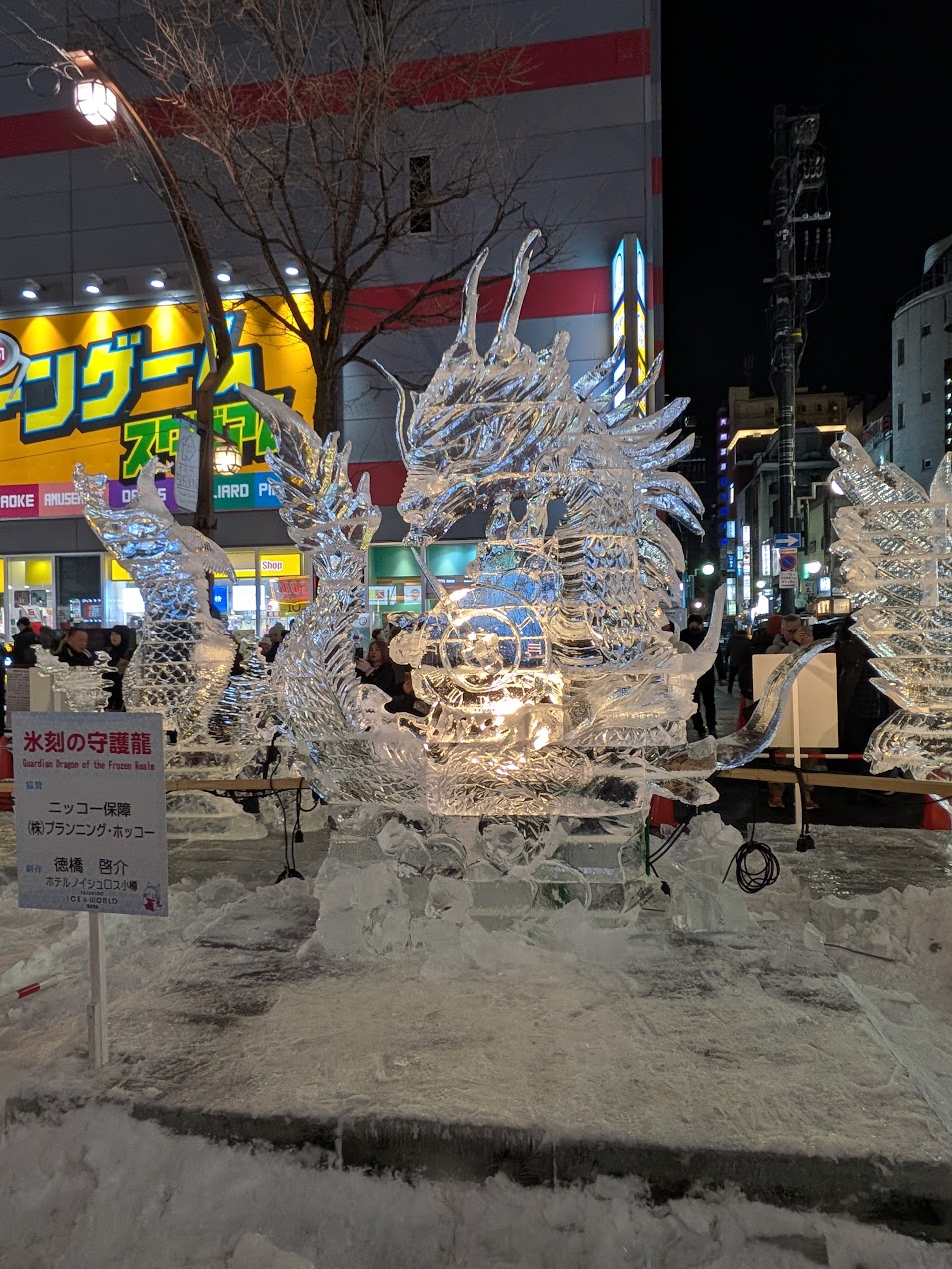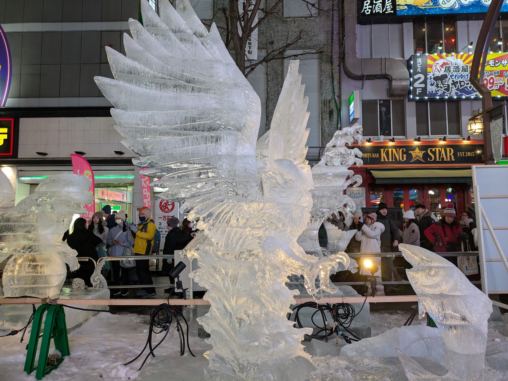 We moved on to Susukino to see the ice sculptures. They were beautiful, though the location in the heart of the entertainment district is… distracting. You’re trying to appreciate the artistry of an ice swan while navigating the neon chaos of the city’s nightlife. We pivoted to Genghis Khan (lamb BBQ) for dinner, which was, without a doubt, the best meal I’ve had in Sapporo. It was so good I almost forgot my feet were frozen.