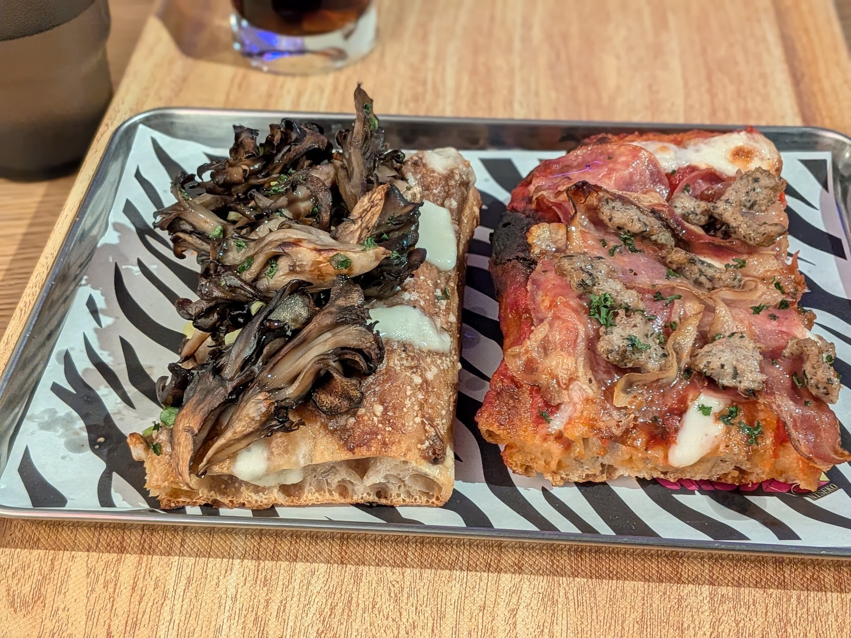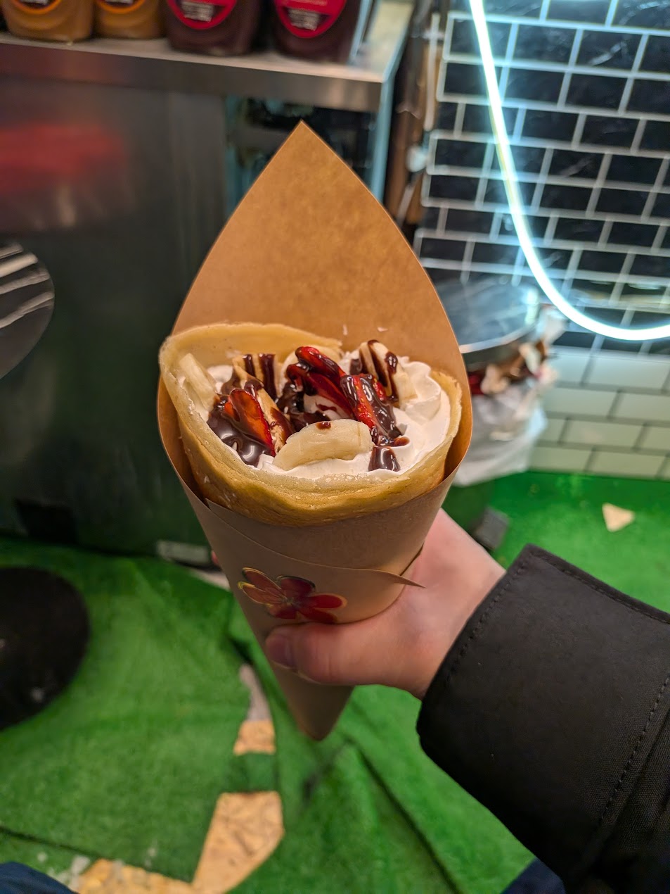 For dinner, we hit up Baby Crosta for some Roman-style slices. The pizza was legit, and the maitake (dancing mushroom) slice was a surprise highlight—very earthy and a much-needed break from the usual toppings. We followed that up with a massive strawberry banana chocolate crepe from a nearby stand because, after a four-hour “marathon” on a green run, I felt I’d earned every single calorie.
