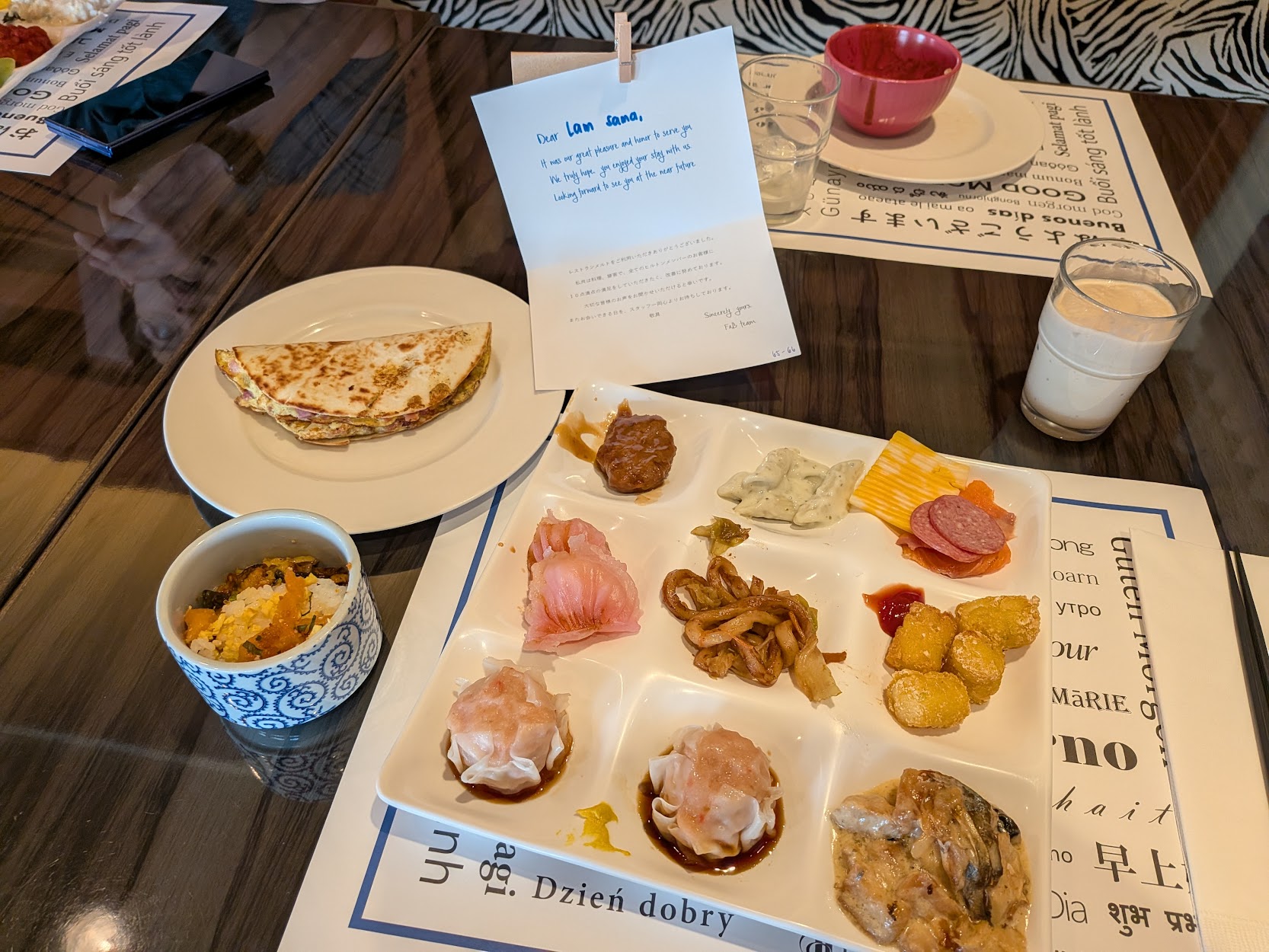 The morning started at the Hilton breakfast buffet with a culinary mystery: I ordered a custom quesadilla, only to find out they don’t serve salsa or guacamole. It was just cheese and a dream, apparently. As we checked out, the staff handed us a farewell gift of cookies and a letter addressed to “Lam-sama.” I’m not sure if I’ve officially been promoted to royalty or if they just liked my checkout style, but I’ll take the title (and the cookies).