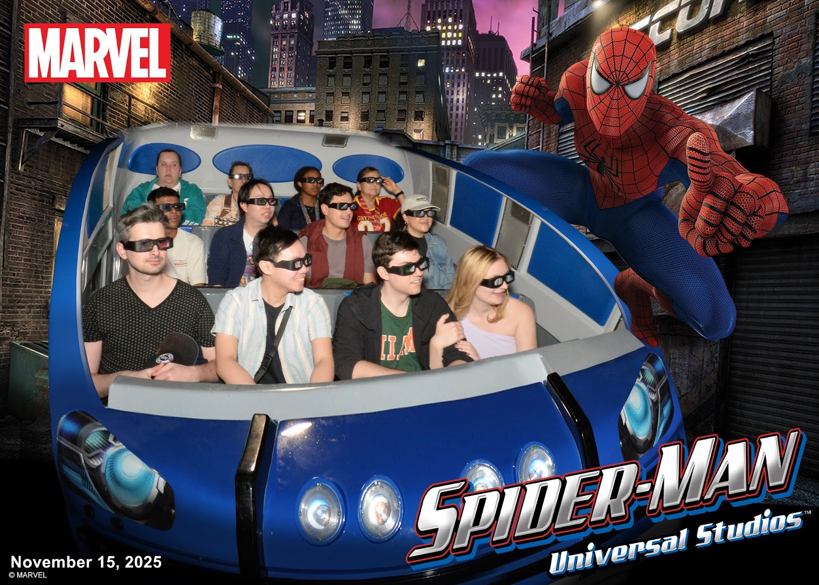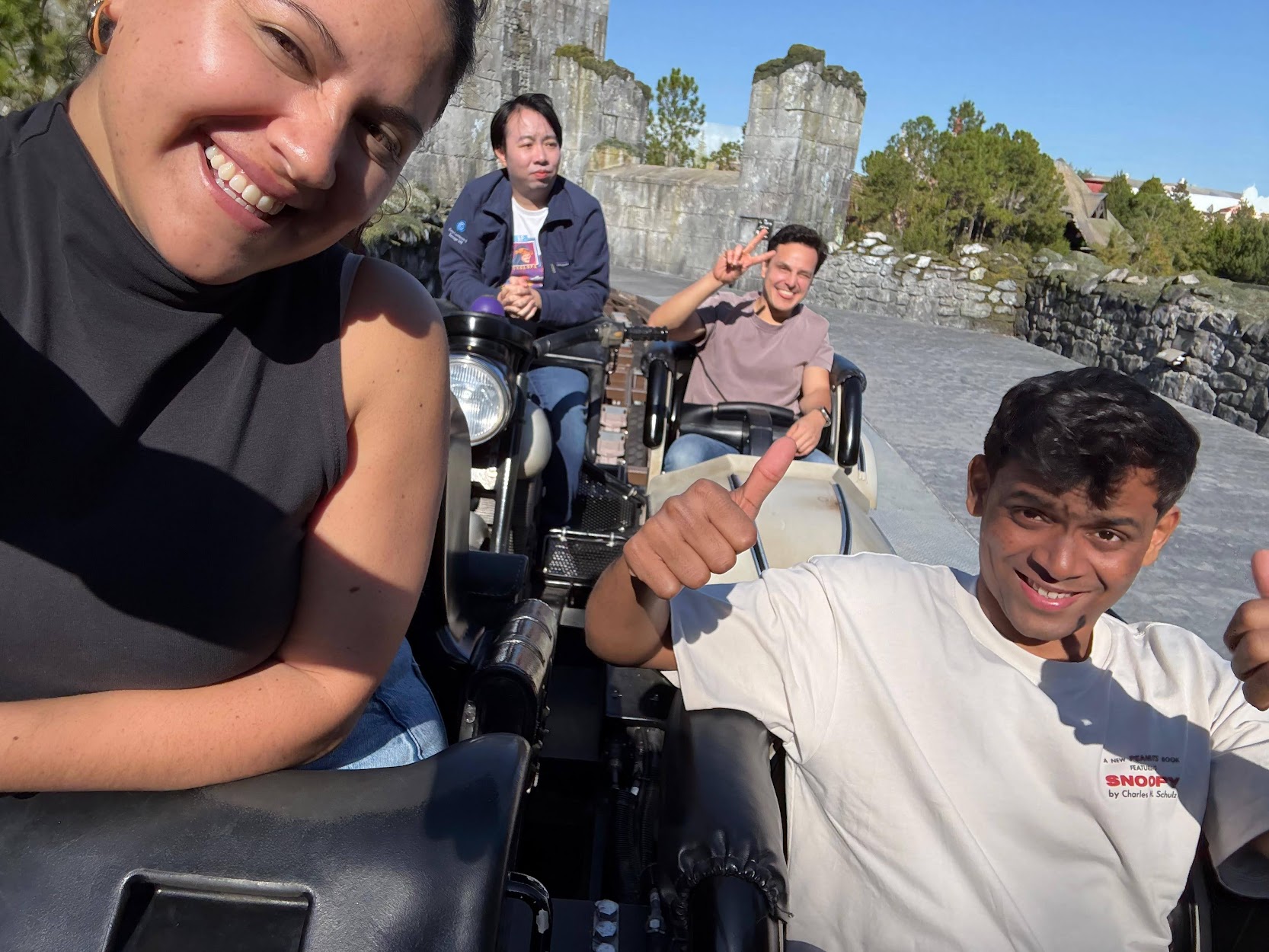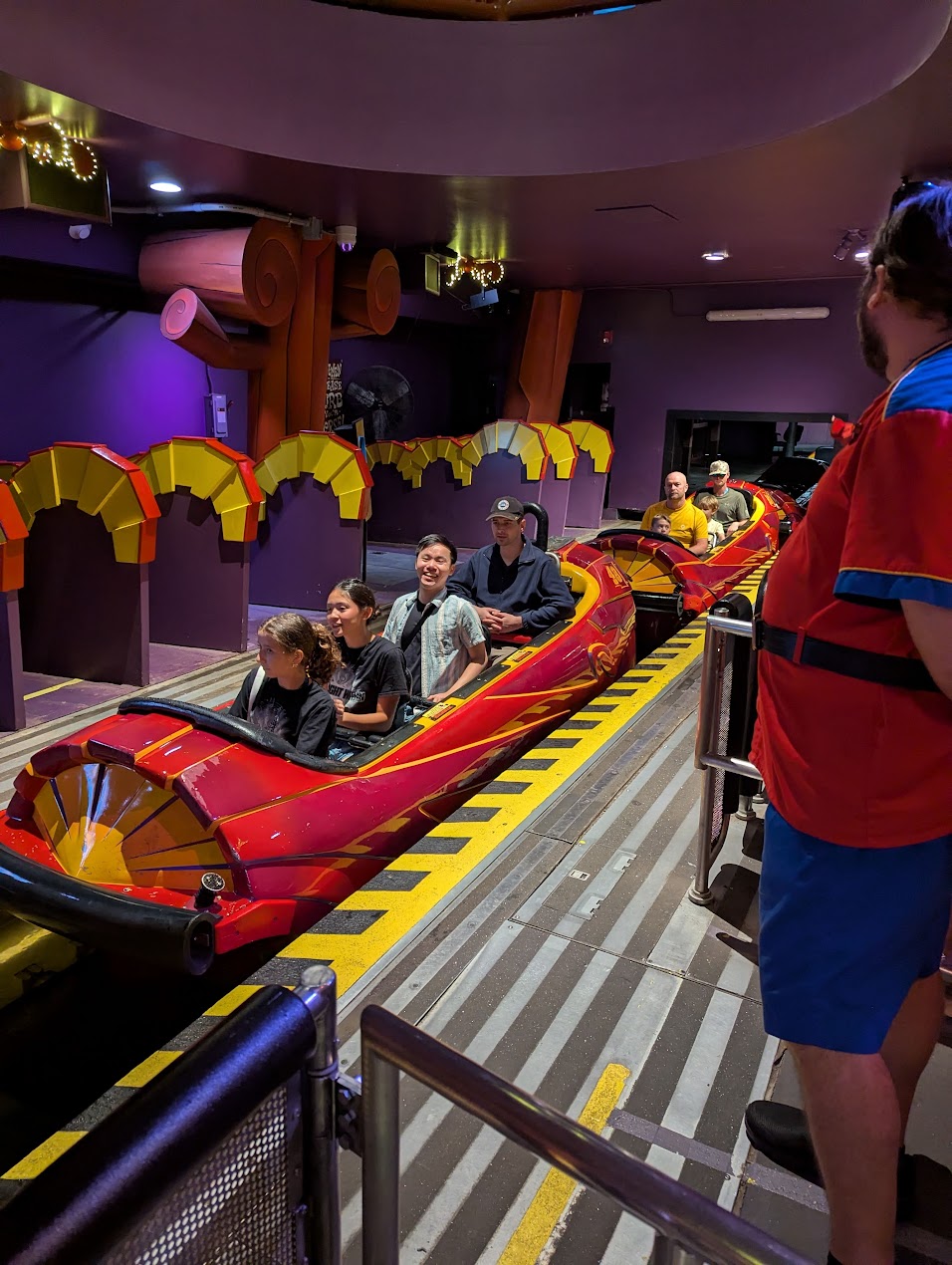 Lunch at Finnegan’s was satisfying (onion rings, fish and chips), but decidedly “normal theme park food.” Next, The Simpsons Ride—a bit dated, but I enjoyed the ancient Waterworld references. Mariuxi bought a massive pink donut outside and immediately executed a spectacular drop-and-grieve performance while taking a photo. We also hit up Men in Black Alien Attack, a fun shooting ride similar to Buzz Lightyear. I scored the highest of the four of us (me, Nick, Evan, and Nikhil)—a nice win!
