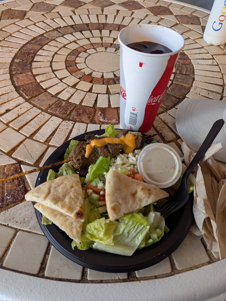 Lunch at the Lost Continent was a necessary cooldown, featuring my kebab salad. After hitting Hagrid’s Motorbike Adventure (and shedding a tear for the closed Forbidden Journey), we chugged some essential frozen butterbeer. The group then began to splinter: Nick and Jeff left (not enough Express Pass power), and Mariuxi went shopping.