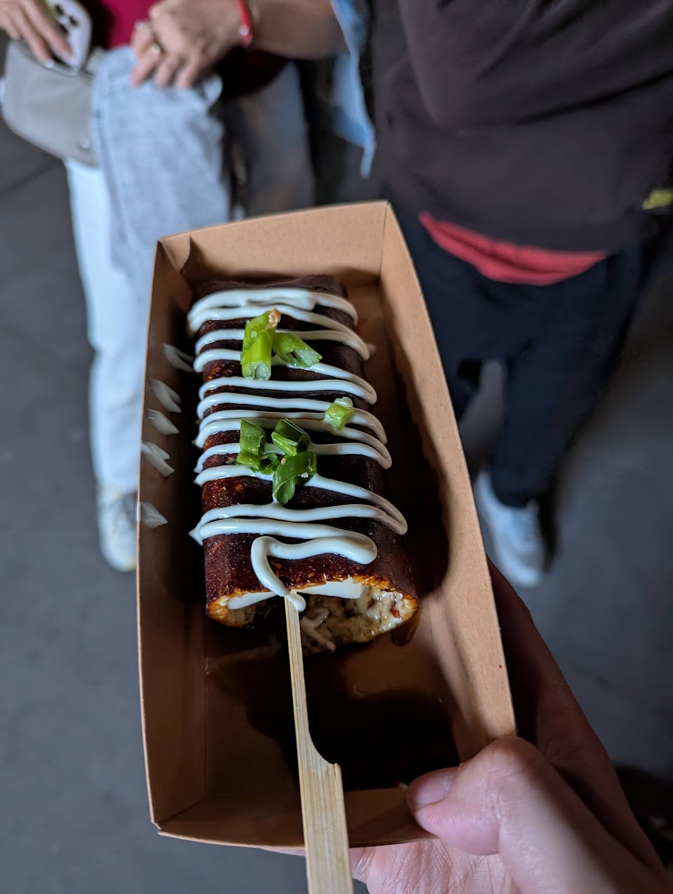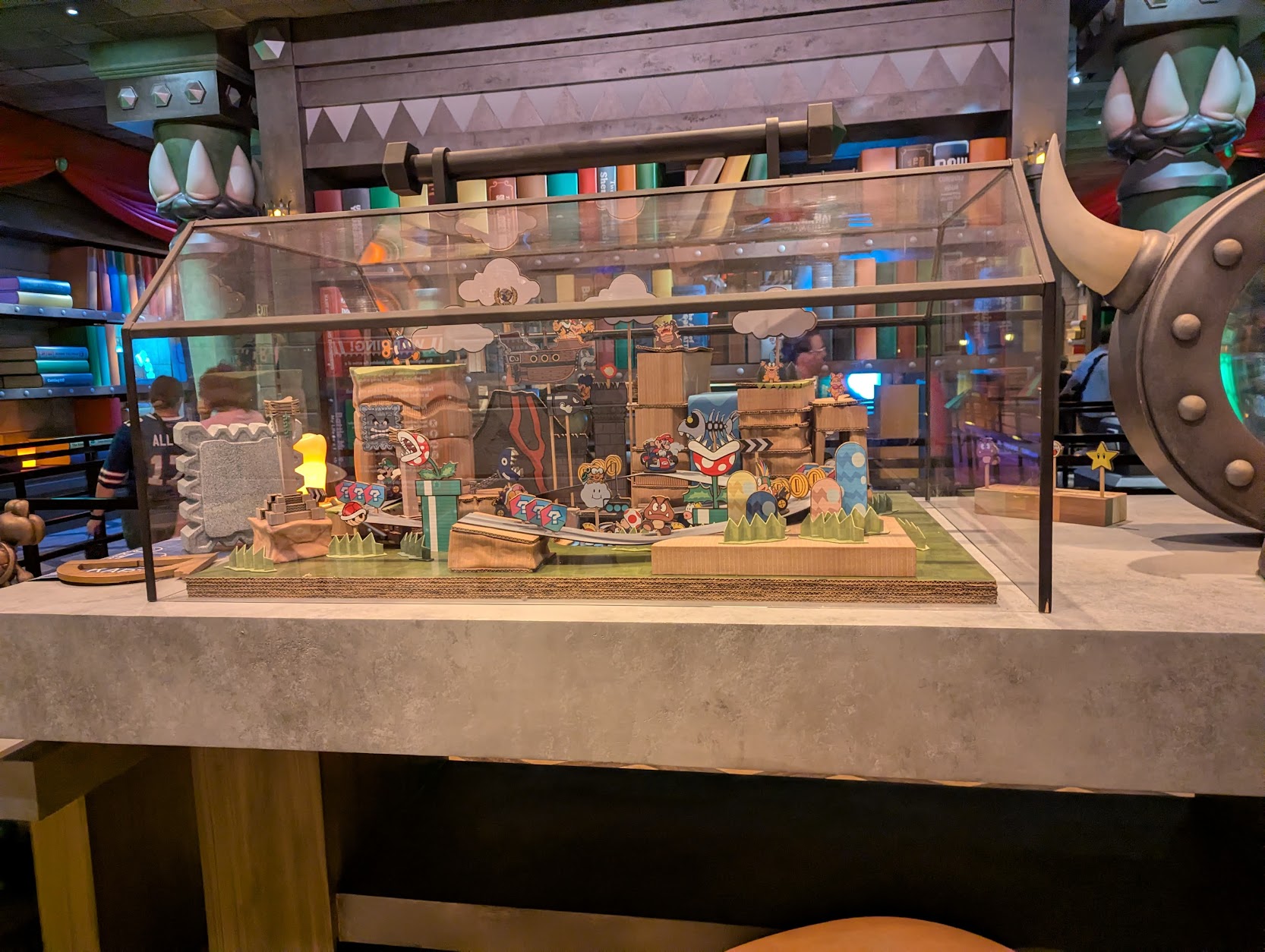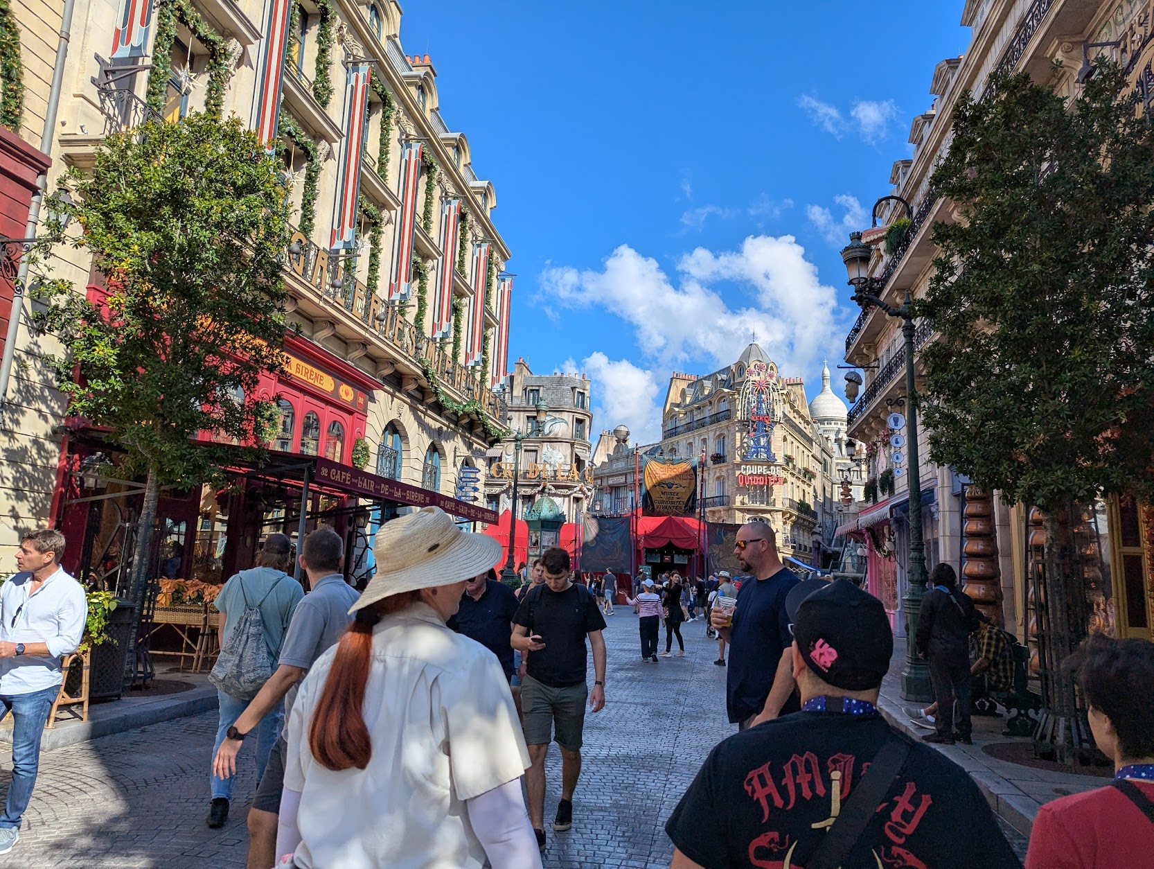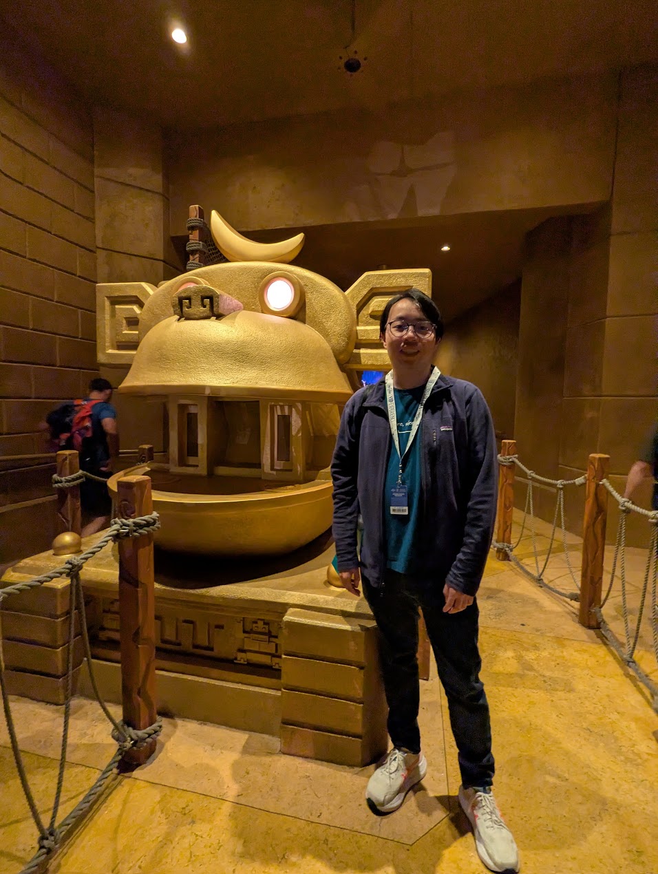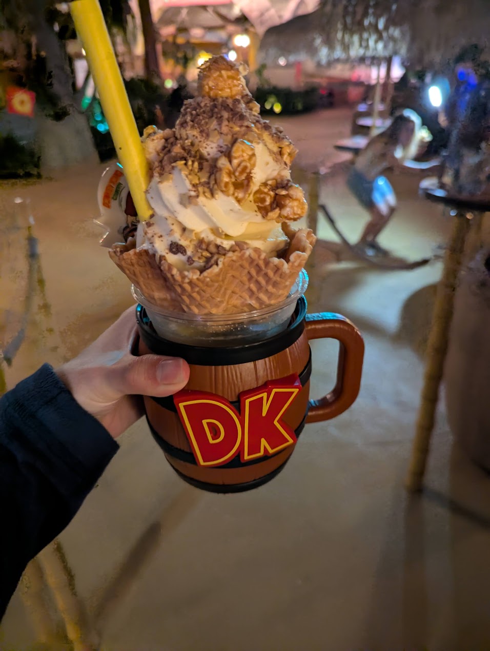 Feeling 100% human again, we met Nick and Jeff and caught the excellent Le Cirque Arcanus show (after the Untrainable Dragon show was canceled, then uncanceled and seen later). We marathoned Stardust Racers, confirming the Yellow track is superior, all while I consumed a Tteokbokki skewer, a Donkey Kong-themed ice cream/soda with a collectible mug, and a Philly Cheese Dog. We closed the park by watching the majestic light and water show.