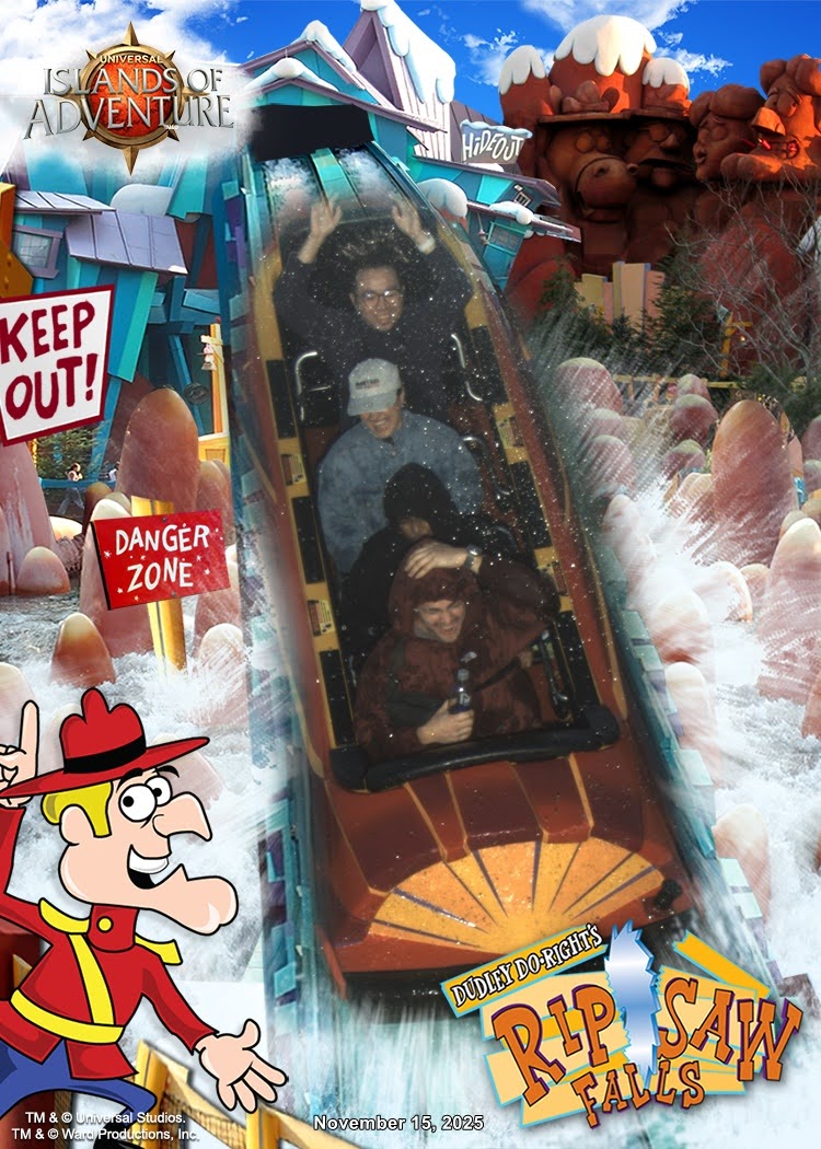 Then came the baptism by H₂O. We decided to get the water rides out of the way, which is code for “willingly subjecting ourselves to a full-body power-washing.” Dudley Do-Right’s Ripsaw Falls, Popeye and Bluto’s Bilge-Rat Barges, and Jurassic Park River Adventure left us looking like drowned rats. We then paid tribute to the god of warmth by cowering under a paid heater (worth every penny) before conquering my new life obsession: Velocicoaster. It’s not just a ride; it’s a religious experience.
